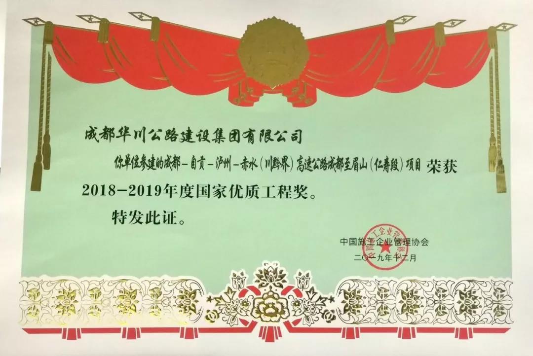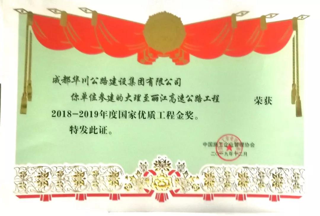 集團在2018年組織申報的“大理-麗江高速公路”、“成都-自貢-瀘州-赤水高速成仁段”項目于今年12月分別榮獲“國家優(yōu)質(zhì)工程金獎”、“國家優(yōu)質(zhì)工程獎”兩項殊榮,實現(xiàn)了集團參建工程在國家優(yōu)質(zhì)工程(金)獎上的突破。