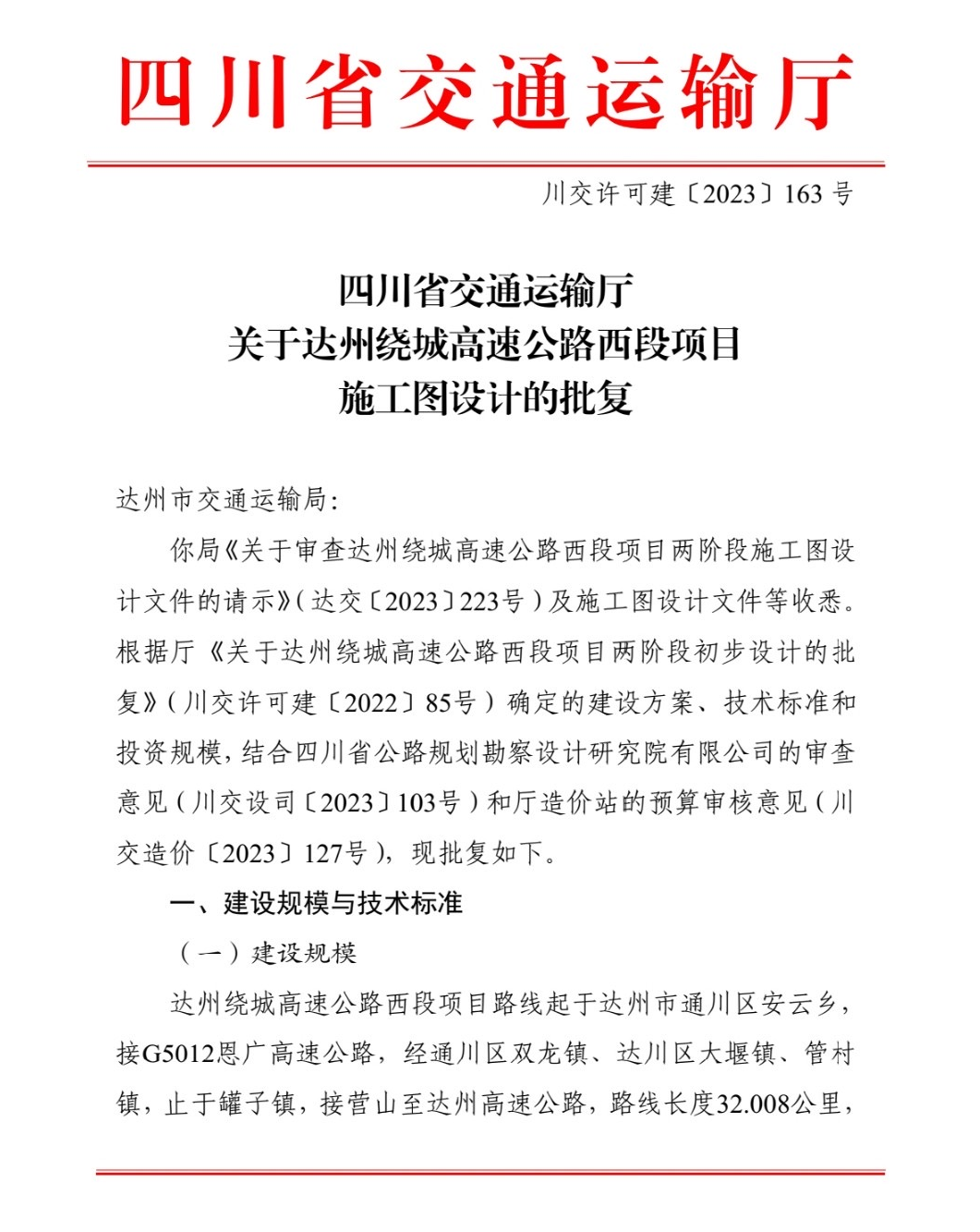 9月12日由集團勘察設計分公司設計的達州繞城高速公路西段項目施工圖設計獲四川省交通運輸廳批復。